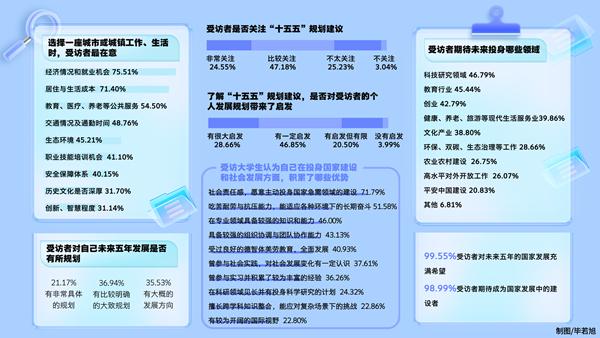 ![]() 在海南文昌玉福宫的“玉西游”项目前,游客拿着手机通过小程序对着玉雕人物拍照,屏幕上立刻跳出孙悟空、唐僧的虚拟形象,以人物口吻对话互动并且将游客引入沉浸式的实景剧本杀。游客可以在小程序的引导下穿梭在40多座玉雕像之间,探索西游故事。这是海南大学学生单元杭和团队为景区打造的互动场景。读书期间,单元杭牵头成立了“元旅科技”,把目光锁定在“AI+文旅”的交叉领域。关注到“十五五”规划建议中的“丰富高品质旅游产品供给,提高旅游服务质量”,单元杭更加明确了未来方向。“现在游客更看重情绪共鸣和个性化体验。年轻人需要社交场景,老年人看重康养舒适,亲子家庭想要互动学习,这些需求都能通过数字化手段满足。” “‘十五五’规划建议对新型工业化、‘双碳’目标的部署,与我的专业高度契合,也让我更加明确了科研方向——攻克能源领域关键核心技术,为经济社会发展全面绿色转型添砖加瓦。”天津大学工程热物理专业博士刘建宏从2019年投身太阳能制氢技术的相关研究。“十五五”规划建议发布后,这位95后主动研读,了解与自己研究领域相关的内容。 2026年是“十五五”开局之年,新年之际,中国青年报·中青校媒面向以大学生为主的青年发起相关调查,了解他们对未来5年的期待与展望,共回收1776份有效问卷。调查结果显示,71.73%受访者关注“十五五”规划建议,其中24.55%受访者非常关注,47.18%受访者比较关注。 96.01%受访大学生从“十五五”规划建议中获得启发 中青校媒调查显示,96.01%受访者认为“十五五”规划建议对个人发展规划有启发,其中28.66%受访者觉得有很大的启发,46.85%受访者感到有一定的启发,20.50%受访者觉得有启发但有限。 范凌翔是清华大学自动化系的大三学生,从大一开始,他就加入了学校人工智能安全研究方向的实验室。在“十五五”规划建议中,他最关注的是“加快高水平科技自立自强,引领发展新质生产力”。从入校后研究方向的确定,到未来个人成长发展,范凌翔坦言,他的每一步决定离不开政策导向。“对国家而言,这些领域关乎发展大计;对个人而言,将努力投入国家所需方向,既能实现个人价值,也能服务社会发展进步。” 北京师范大学历史学院的刘翔宇格外关注“十五五”规划建议中“办好人民满意的教育”的相关内容。2023年,他作为学校第二十五届研究生支教团的一员,到新疆库尔勒市第四中学支教。此后,他带队深入新疆塔城、四川木里、贵州习水等支教地调研,与当地教育部门、学校老师座谈,摸清各地结构性师资缺口,这些调研结果成为研支团教师力量培养的依据。这些经历让他了解了西部教育从让孩子“有学上”到“上好学”的变迁,也让他对“十五五”规划建议中“统筹义务教育优质均衡发展”的内涵有了更深刻的理解。“优质均衡不仅是资源的均等分配,更是让每个孩子都能获得适配的、高质量的教育。” 马存祥是吉林大学植物科学学院资源利用与植物保护专业研三学生,他的研究方向是土壤保护与绿色投入品的研发,这与“十五五”规划建议中强调的绿色农业高度契合。他日常的研究,就是开发能替代传统农药和化肥、对环境与作物无害的绿色产品,比如为种子包裹微生物菌肥外衣,经过特殊处理后播种,作物长势和抗逆性会显著优于普通种子。“十五五”规划建议给马存祥奠定了信心,他期待,未来5-15年,“新农业文明”能在乡村落地发芽。 99.55%受访大学生对未来5年的国家发展充满希望 调查显示,99.55%受访者表示对未来5年国家的发展充满希望。未来5年,受访者最期待社会发展变化带来的便利或福利,是在完善的就业政策下找到满意的工作、劳动权益得到保障(72.92%),此外还有享受到良好的社会保障(66.44%)、在高质量教育体系中精进学业(65.99%)、享受便捷且完善的医疗服务(59.46%)、享受更富足的精神文化生活(59.40%)、友好的城乡生活配套政策(49.27%)、生态环境得到更好的保护(48.87%)、家乡等地得到更好的发展建设(48.65%)、新兴科技产业带来更多生活便利(48.31%)、在创业过程中受到更多政策扶持(44.14%)等。 北京体育大学的汪粤最关心的是全民健身及相关公共服务体系的完善。在汪粤看来,从2022年北京冬奥会带动3亿人参与冰雪运动,到近年来各个城市开展的马拉松和越野跑、苏超、村BA等火热,体育运动成为人们茶余饭后闲谈的话题。“群众体育能够创造新的经济增长点。体育运动可以带火一座城市,还能带动当地的文旅消费,促进当地经济发展。作为一名体育行业从业者,见证这种时刻感到很幸福。” 希望未来从事科研领域的受访者,最期待获得的机会,是多参与对国家战略、社会发展有意义的重点科研项目(68.02%)。其次是学习如何依托人工智能等新型工具、辅助科研创新工作(62.22%);科研仪器、公共平台等共享共建,可以跨机构使用更优质的科教基础设施(60.30%);有更多机会学习其他学科知识,拓展交叉学科相关领域(53.77%);等等。 关于“十五五”规划建议中“加快高水平科技自立自强”的内容,让有着切身经历的刘建宏深感共鸣。“科研中经常要购买实验设备和材料,很多核心测试设备只能依赖进口,国内产品发表论文时容易被质疑数据真实性。”科研中的经历让刘建宏更加坚定了自主研发的决心,“我们现在研发电解池、实验设备,都是创新性研究,就是