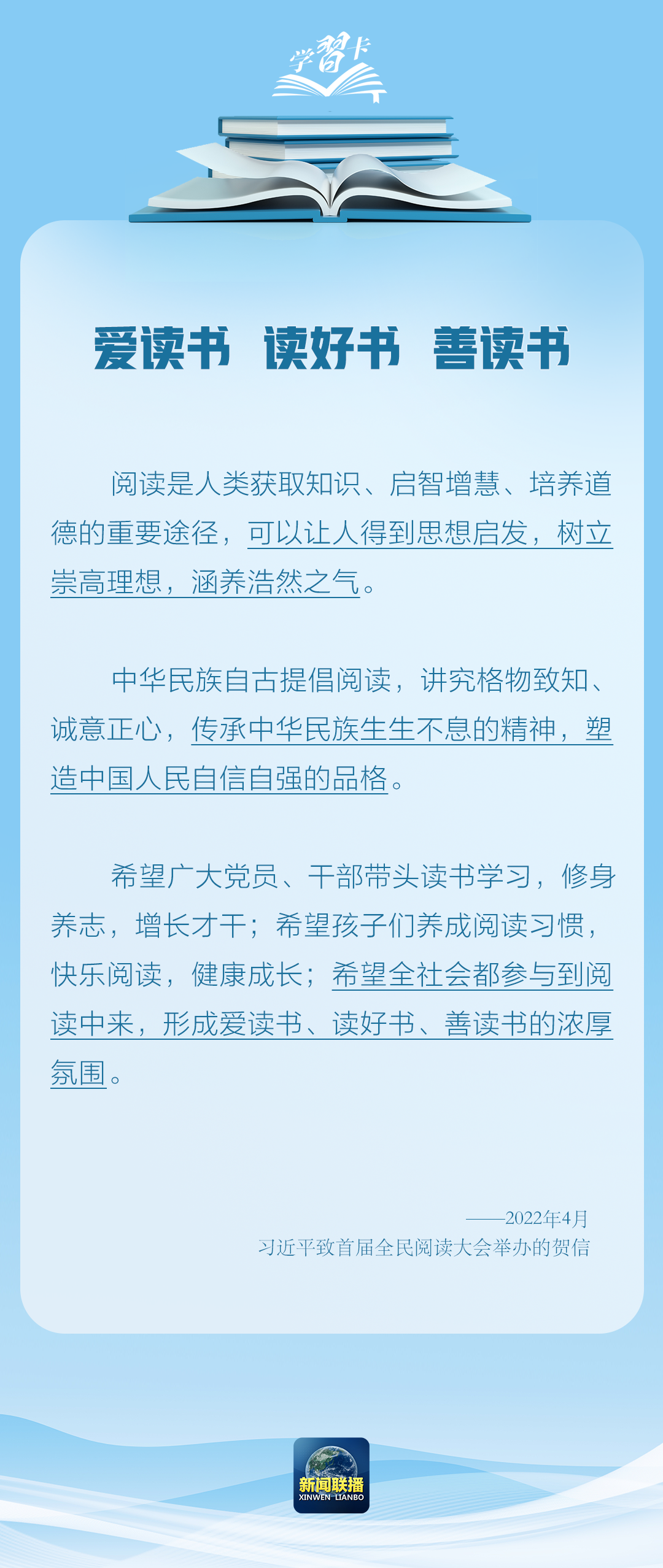 习近平总书记强调,“要建设全民终身学习的学习型社会、学习型大国”,“希望全社会都参与到阅读中来,形成爱读书、读好书、善读书的浓厚氛围”。